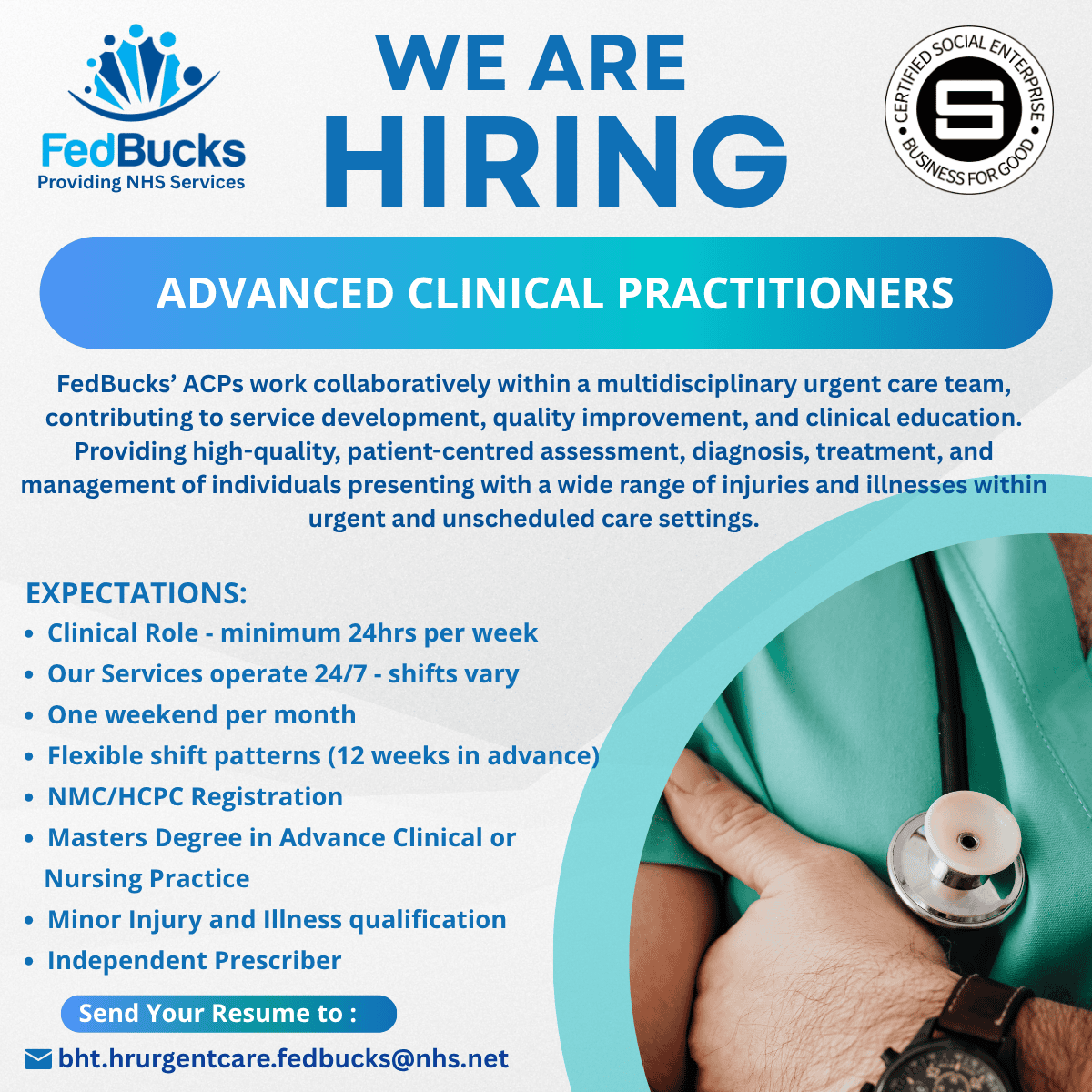 The ACP will work collaboratively within a multidisciplinary urgent care team, contributing to service development, quality improvement, and clinical education.